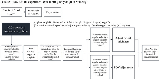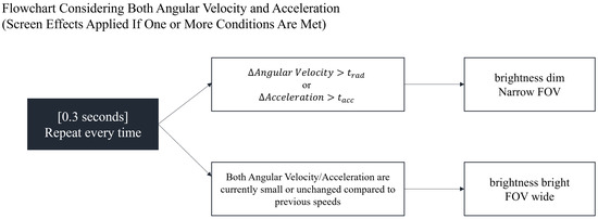 Figure 9 displays the algorithm for the secondary experiment, which considers both angular velocity and acceleration. If one or more values exceed the threshold for either angular velocity or acceleration, screen effects are applied, similar to the procedures in the earlier experiments.