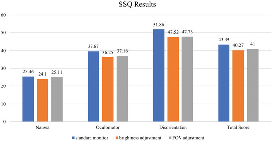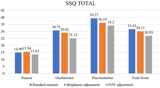 When analyzing the SSQ results over three days, it was observed that monitors with brightness and FOV adjustments consistently produced lower levels of motion sickness across different categories compared to the standard monitor with no effects (Figure 11 and Table 1). Specifically, motion sickness levels in categories such as Nausea (related to general motion sickness), Oculomotor (related to eye movement impairment), and Disorientation (related to loss of spatial orientation) were all lower for monitors with brightness and FOV adjustments. An overall analysis of the SSQ results showed that monitors with these adjustments led to reduced motion sickness levels across these categories, with approximately a 10% reduction in Oculomotor and Disorientation-related symptoms and an overall reduction in motion sickness of 5–10%.