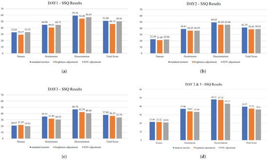 SSQ scores by individual day in the main experiment: (a) Day 1. (b) Day 2. (c) Day 3. (d) Combined SSQ scores from Days 2 and 3.