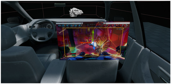 In the experiments conducted for this study, motion sickness levels were measured by applying three different cases to the in-vehicle display. Participants were seated in a one-person motion simulator wearing a Head-Mounted Display (HMD). In the virtual environment, participants were seated in a fixed position corresponding to the rear seat of a vehicle and were instructed to maintain visual fixation on the in-vehicle display throughout each trial (Figure 3). The virtual vehicle interior and exterior environments were implemented using Unreal Engine 4.27. The motion output was generated using the internal dynamics engine of the motion simulator, based on the maximum tilt configuration of degrees. Although participants primarily focused on the display content, the peripheral motion of the virtual environment could be perceived through the front-facing windshield and the right-side window. This setup allowed participants to receive partial peripheral visual motion cues during the task. The experimental setup utilized an HTC VIVE and a one-person motion simulator connected to a PC.