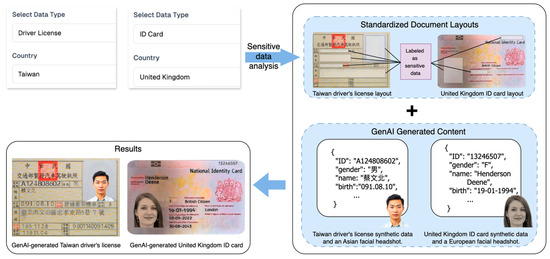 As shown in Figure 2, in the Input Module, users specify the type of sensitive data they want to detect, such as Taiwan driver’s licenses and United Kingdom ID cards. Once selected, the system automatically generates a corresponding prompt for GenAI, ensuring that both the image and text outputs align with the selected document type. In the Generation Module, these prompts are used to create synthetic sensitive images by combining GenAI-generated content with standardized document layouts. This layered generation strategy enables the system to produce outputs that closely resemble real-world sensitive documents, which, in turn, improves the accuracy of visual feature matching during retrieval. Our system utilized GenAI in this module based on two practical advantages: extensibility and data diversity. First, the system is designed to support a broad range of document types, each with distinct formats. GenAI allows us to generate realistic examples for new types efficiently using prompt-based control, thereby avoiding the need for manually reconstructing document templates. Second, even for the same document category, GenAI produces natural variations in layout and content. This diversity improves the generalizability of visual features and enhances the coverage of the downstream image-based search, allowing the system to detect a broader range of potential leaks.