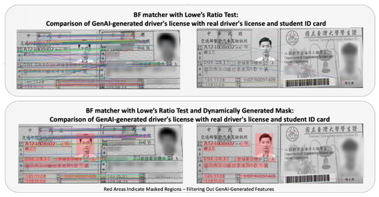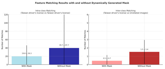 To quantitatively evaluate the effectiveness of our feature matching with the dynamically generated mask approach, we conducted a comparison experiment consisting of 12,720 matching operations. We selected 80 images of Taiwan driver’s licenses and 80 unrelated images. Each Taiwan driver’s license was used as a query image, matched against the remaining 159 target images under two configurations, with and without the dynamically generated mask. The results are shown in Figure 8 and summarized below: