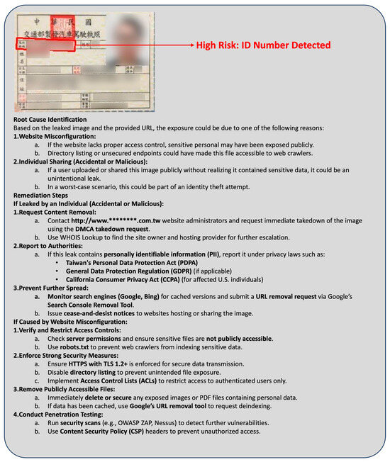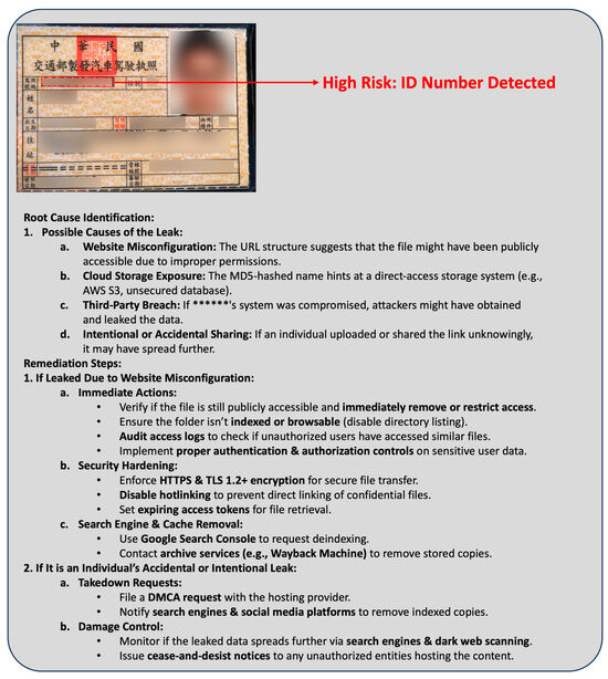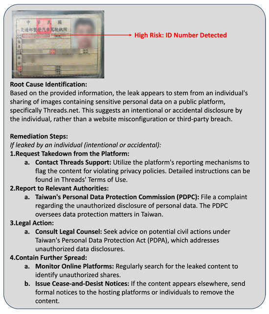 As shown in Figure 4, it provided recommendations for addressing a data leakage incident involving the unauthorized sharing of PII on Threads.net. The root cause analysis suggests that the leak resulted from an individual’s intentional or accidental disclosure rather than a website misconfiguration or third-party breach. To mitigate the issue, the recommendations include requesting content removal by reporting the violation through Threads.net’s support system, filing a complaint with Taiwan’s Personal Data Protection Commission (PDPC) to address legal and regulatory concerns and seeking legal counsel to explore potential actions under Taiwan’s Personal Data Protection Act (PDPA).