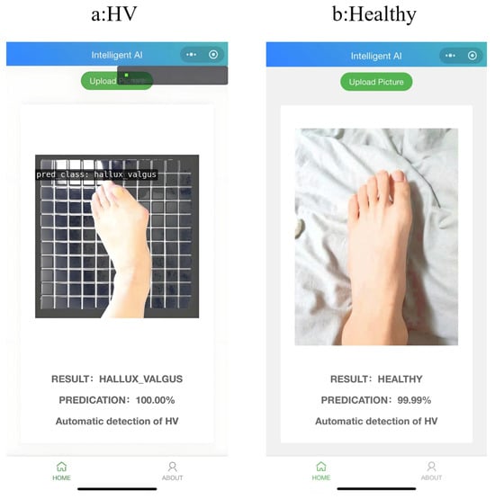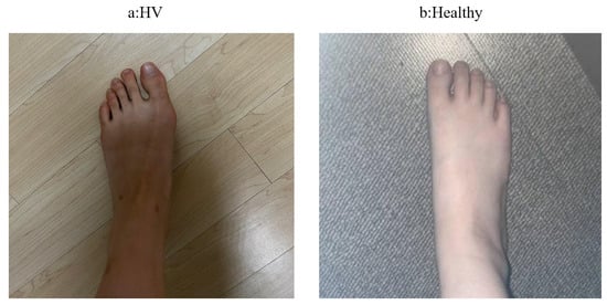 Hallux valgus (HV) is a foot disease in which the angle of the joint between the thumb and the first metatarsal bone (also known as the “big toe”) is greater than or equal to 15 degrees. It is generally caused by a variety of conditions. Hallux valgus is a common foot deformity worldwide, with a global overall prevalence and incidence rate of 19%, which means that one in five people suffer from hallux valgus to varying degrees, and the incidence rate in women is as high as 23.74% [1]. As shown in Figure 1, Figure 1a represents HV, and Figure 1b represents a healthy foot. Clinically, X-rays are often used to determine the diagnosis and treatment plan for hallux valgus. However, X-rays have a certain radiation effect on the human body [2], and patients need to go to the hospital to take X-rays, which causes a lot of trouble. Therefore, if there is an easy-to-use method that can be used to initially screen for hallux valgus through non-radiographic photos, it will greatly improve the doctor’s work efficiency and reduce the patient’s pain and financial losses.