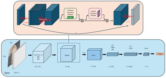 MobileNetV3 is a further optimization of MobileNetV1 and MobileNetV2 by Google [21,22], which additionally introduces SE and combines resource-constrained NAS with NetAdapt to design the most suitable network structures, large and small [23]. On this basis, MobileNetV3 also uses the HardSwish activation function, which can achieve better performance at a deeper level. Meanwhile, MobileNetV3, based on MobileNetV2, merges the last depth separable convolution module with the output convolution layer, advances the average pooling to reduce the feature size, and removes the 3 × 3 depth convolution layer that does not change the feature dimension. This greatly reduces the computational cost of the output layer, thereby improving the inference speed and efficiency of the model. Thanks to these improvements, MobileNetV3 is more suitable for low-computing-resource environments than other classification models. On mobile devices (such as mobile phones and embedded devices), MobileNetV3 can be used in real time, with a 25% improvement in inference speed. On the ImageNet classification task, MobileNetV3 achieves a Top-1 accuracy of 75.2% on ImageNet, while MobileNetV2 is 71.8%, an improvement of 3.4%.