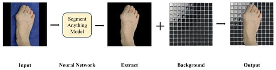 The backgrounds of some images in the dataset are too monotonous, and this may cause the model to mistakenly regard background information as useful features during the learning process, which affects the generalization ability and robustness of the model. To solve this problem, we used the segment anything model (SAM) to accurately extract the foot area [25]. Then, the extracted foot area was randomly replaced with different background images (see Figure 3) to simulate various real shooting scenarios, such as different lighting conditions, background colors, and environmental complexity. This process significantly increased the diversity of the data, enabling the model to maintain good performance in a wider range of application environments.