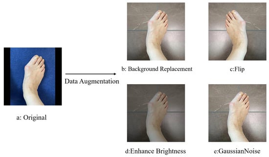 In addition, in order to increase the generalizability of the model, we used rotate, flip, enhance brightness, add noise, and other data enhancement methods to expand the dataset, in order to improve data diversity. An example of applying these techniques to random images in the data enhancement can be seen in Figure 4. Through the data preprocessing and enhancement steps described above, the results provide a more complete picture of true performance and ensure that it can achieve high accuracy and good stability in practical applications. Note that since we use five-fold cross-validation, in each cross-validation iteration, the background replacement operation for the training set is dynamically generated by calling the segment anything model (SAM) in real time, and the validation set always remains the original unmodified data.