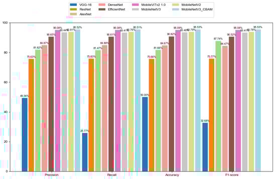We conducted a comprehensive evaluation of the improved MobileNetV3 model’s effectiveness in detecting hallux valgus (HV) in foot images using an expanded dataset and multiple metrics. Over 100 epochs, we compared several models, including VGG-16, ResNet, AlexNet, DenseNet, EfficientNet, MobileViTv2, MobileNetV3, and MobileNetV2. The final performance metrics (accuracy, precision, recall, and F1 score) were calculated as the mean ± standard deviation across all five folds, ensuring a robust and statistically reliable evaluation of generalization ability. These metrics collectively assess a model’s ability to correctly classify data, balancing overall accuracy, false positives, false negatives, and the trade-off between precision and recall. Table 1 presents the results of our testing. The improved MobileNetV3 achieved accuracy, precision, recall, and F1 score values of 95.52%, 95.51%, 95.53%, and 95.53%, respectively. Figure 5 provides a graphical representation of these results, intuitively demonstrating that the improved MobileNetV3 model’s performance has been enhanced and that it has achieved the best results among the compared models. Although the accuracy of MobileViTv2 and the improved MobileNetV3 model were not very different from each other, in computational complexity, the FLOPs and parameters of MobileViTv2 are much larger than the improved MobileNetV3 model, which requires a certain amount of computing power on the user’s device and causes slightly higher latency, resulting in a poor user experience. The improved MobileNetV3 model did not significantly increase in terms of floating-point operations (FLOPs) and parameters compared to the original MobileNetV3. The integration of the CBAM has significantly improved MobileNetV3’s overall classification performance without a substantial increase in computational cost.