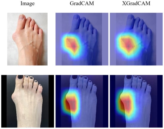 Finally, in order to validate that the proposed model is focusing on medically relevant features rather than spurious background artifacts or skin tone, we employed visual explanation techniques using Grad-CAM and XGrad-CAM. As shown in Figure 6, the highlighted activation regions clearly concentrate around the first metatarsophalangeal joint area—the clinically significant region for hallux valgus detection. These visualizations demonstrate that the model effectively learns to localize and attend to the deformity site associated with HV, instead of relying on irrelevant background patterns, lighting, or color distribution. This suggests a high level of interpretability and anatomical consistency in the model’s decision-making process, which is essential for clinical trust and deployment.