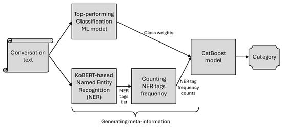 In the third stage, we addressed the limitations of improving classification performance solely through base model tuning by generating meta-information from conversation texts via named entity recognition. Specifically, we extracted entity tags from the text and incorporated them into the model. The final ensemble model combined the prediction probabilities from the base text classification model with the distribution of named entities, using the CatBoost algorithm. Through this process, we developed a total of nine models, as detailed in Figure 2, which show progressively improved performance across the three stages.