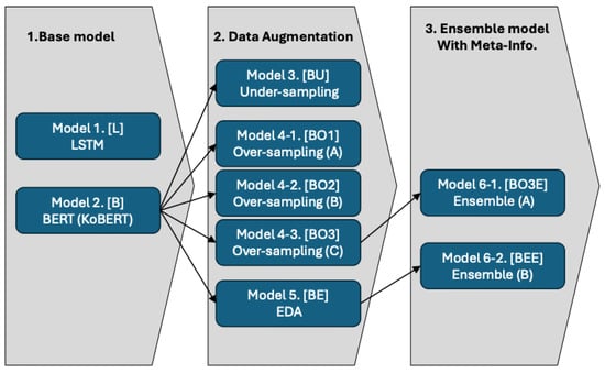 - The first stage: Models 1 [L] and 2 [B] are basic models trained with LSTM and BERT, respectively. As will be explained later, Model 1 showed insufficient classification performance, so subsequent experiments were conducted based only on BERT.