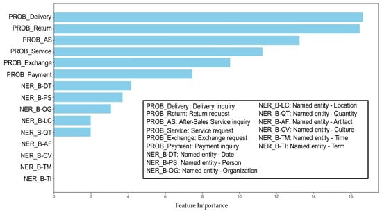 According to the feature importance shown in Figure 3, the category predictions inferred by the BERT model were the most significant features. Among the NER tags, DT (date), PS (person), OG (organization), LC (location), and QT (quantity) were the most important in that order.