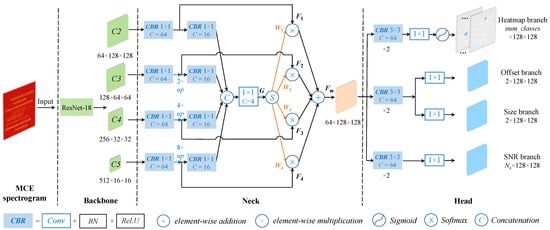 The improved framework is described in detail in this section, comprising the front-end MCE spectrogram and the back-end anchor-free SNR-aware Net. The pipeline is illustrated in Figure 1, where SNR-aware Net is decoupled into three components: the backbone network, the neck network, and the detection head.
