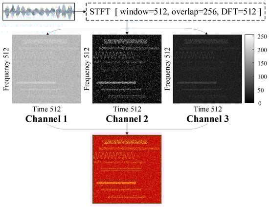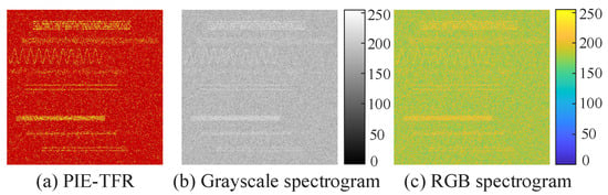 We naturally introduce due to the following considerations: (1) While enhances details in low-grayscale-intensity areas, it compresses and impairs high-intensity regions. The matrix serves as a complementary component, explicitly introducing additional recognition information into the spectrogram. (2) Compared to , undergoes an equivalent antilogarithm transformation, visually emphasizing high-intensity areas. As a result, important signal features such as outlines and textures are further highlighted, as depicted in Figure 2. (3) Since is an intermediate matrix in the generation of , it can be derived without additional computational complexity. After using the same normalization in Equation (2), the matrix is assigned to the third channel.