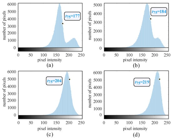 As shown in Figure 3, the histogram statistical characteristics of , derived from the mixed signal in Figure 2, vary at different SNR levels. Here, SNR is defined as the ratio of the mixed signal, which contains multiple signal components, to the background noise. At higher SNRs, the intensity values of the signal and noise regions are clearly distinguishable, resulting in a bimodal histogram distribution. As the SNR decreases, these distributions gradually overlap, leading to reduced contrast and less distinct signal areas. Notably, it can be also observed that the statistical distribution of the noise presents similarity. Specifically, in Figure 3 represents an intensity value where pixels with values lower than account for 75% of the total pixel count (i.e., ). Although the four specific values differ across SNRs, they are positioned similarly in the distribution. Thus, a statistical threshold can be effectively set to filter out a consistent percentage of noise while preserving foreground signals, even across varying SNRs.