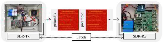 Figure 5 illustrates the workflow for creating a labeled dataset, which combines both synthetic signal generation and real-world data capture techniques. Specifically, the labels for the spectrograms are automatically generated by logging the parameters used during the synthetic data generation process. These parameters are detailed in Table 1. The signals are then transmitted and collected over-the-air, introducing real-world impairments. To ensure label consistency between the transmitter and receiver, we implemented a synchronization mechanism that periodically transmits preambles. For signal collection, we used a custom RF transceiver equipped with a vertically polarized omnidirectional antenna.