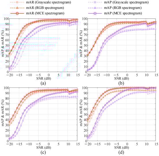 Furthermore, we investigate the performance comparisons across different SNR levels, as shown in Figure 6. Taking SNR-aware Net as an example, when the SNR exceeds −5 dB, the MCE spectrogram achieves 9.4% and 8.3% higher mAPs compared to grayscale and RGB spectrograms, respectively, along with 5.5% and 4.5% higher mARs. When the SNR is between −20 dB and −5 dB, the mAP of the MCE spectrogram increases by 8.9% and 6.6% over grayscale and RGB spectrograms, while the mAR increases by 8.1% and 6%, respectively. Similarly, although the extent of improvement varies among networks, the MCE spectrogram consistently provides performance gains for the other three networks at both high and low SNRs, further demonstrating its modality superiority. This outcome is expected because the visual enhancement channel enables the network to focus more effectively on signal regions for feature extraction even at low SNRs. Additionally, the information complementary channel provides additional information support at higher SNRs and helps the recognition information encoded in signal regions less affected by noise as SNR decreases.