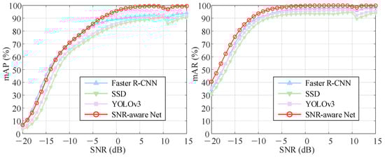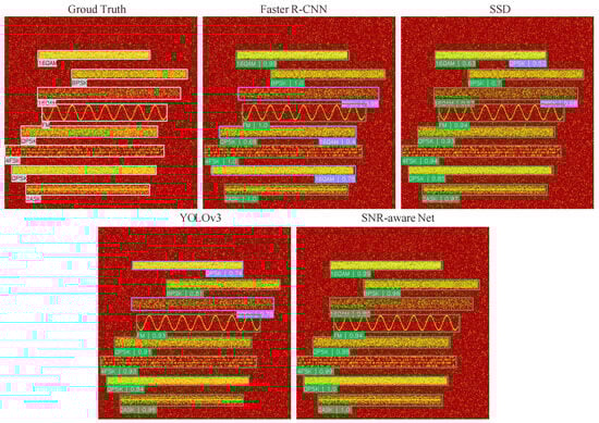 To facilitate a clear comparison, we replot the performance versus SNR curves of the four networks with the MCE spectrogram as input in Figure 7. In terms of mAR, SNR-aware Net consistently outperforms the other networks at each SNR level. In terms of mAP, Faster R-CNN performs better when the SNR is below −5 dB. This superior performance of Faster R-CNN at low SNRs has been demonstrated in [5], as it is a two-stage region proposal-based network, which is well suited for signal localization and identification. Notably, despite all being one-stage networks, SNR-aware Net achieves significantly better performance than SSD and YOLOv3 at low SNRs through more task-oriented feature fusion and an efficient output paradigm, matching the performance of Faster R-CNN. When the SNR exceeds −5 dB, the mAP of SNR-aware Net is clearly the highest among the compared networks. To further investigate its superiority, we conduct further evaluations on the 5 dB subtest set.