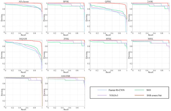 First, we plot the precision–recall curves (PRCs) of the networks to visually compare their joint classification and localization performance, as shown in Figure 8. It is evident that the curve of SNR-aware Net consistently encloses the curves of the other networks for each signal class, indicating its superior ability to detect more signals with higher classification confidence and more precise regression.