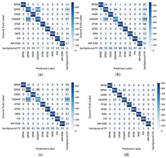 Furthermore, we plot confusion matrices to visualize the classification performance of the four networks, as depicted in Figure 9. The rows represent the true classes, and the columns represent the predicted classes. The diagonal cells correspond to the correctly detected true positives (TPs). The last column represents background false negatives (FNs), which are missed GTs. The last row represents background false positives (FPs), which are detections predicted as a certain class but with IoUs below the threshold with all GTs. The other cells represent FPs, where the detection’s IoU with a certain GT exceeds the threshold, but the class does not match. As shown in the second row of Figure 9a, the detector misses 144 QPSK signals. Additionally, while correctly detecting 750 QPSK TPs, there are 558 16QAM FPs within the QPSK GT regions due to confusion between QPSK and 16QAM. A similar issue is observed in the fourth row, indicating that Faster R-CNN struggles to accurately distinguish between QPSK and 16QAM. Figure 9b,c show slight improvements achieved by SSD and YOLOv3, but they still exhibit poor recall and regression accuracy, leading to more background FNs and FPs. In contrast, Figure 9d demonstrates the superior performance of SNR-aware Net, which effectively differentiates each signal class and reduces misses and background FNs.