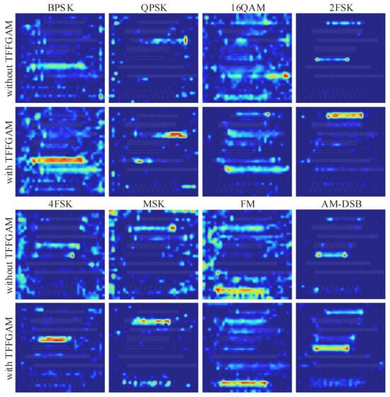 In addition, Table 5 presents the results of ablation experiments on SNR-aware Net. The SNR-aware Net without TFFGAM and the SNR branch is utilized as the baseline. It can be seen that the model with TFFGAM makes progress in precision while maintaining a higher recall. This improvement can be attributed to the trainable gating mechanism, which enables the network to capture visual and semantic feature combinations with better robustness and discrimination. We also visualize the feature patterns of the models with and without TFFGAM using Grad-CAM [40], as depicted in Figure 11. Grad-CAM leverages gradients to highlight the activation and contribution distribution of features. As can be seen, the model without TFFGAM exhibits scattered activations in regions that are not highly relevant to the specific categories being analyzed. In contrast, the model with TFFGAM shows more efficient feature patterns. Specifically, the areas that are most informative for the model’s predictions are strongly activated. These regions are crucial for identifying and localizing target signals. Furthermore, the responses from category-insensitive areas are effectively suppressed. Additionally, the inclusion of the SNR branch results in a 2.4% increase in mAP and a 1.1% increase in mAR. It optimizes the gradient backpropagation of the classification task, alleviates the feature misalignment during training, and further enhances the signal recognition performance. The full implementation of SNR-aware Net, including both TFFGAM and the SNR branch, achieves the best performance, with improvements of 6% for mAP and 3.9% for mAR.