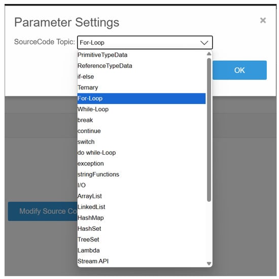 - Wint, S.S.; Funabiki, N. A proposal of recommendation function for element fill-in-Blank problems in Java programming learning assistant system. Int. J. Web Inf. Syst. 2021, 17, 140–152. [Google Scholar] [CrossRef]
