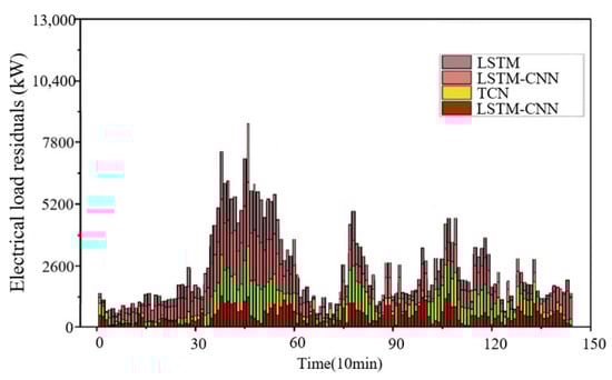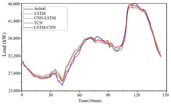 - Table 4 presents the load forecasting results of different models in the Tétouan municipal power supply dataset. It can be known from Table 4 that, compared with the LSTM model, the CNN-LSTM combined model that adds a CNN for feature extraction on the basis of LSTM, and the TCN model, the RMSE of the three-channel LSTM-CNN model decreased by 239.202 MW, 215.660 MW, and 27.887 MW, respectively. MAE decreased by 202.1 MW, 177.6 MW, and 42.0 MW, respectively; MAPE decreased by 0.566%, 0.465% and 0.104%, respectively. It is indicated that the LSTM model after feature extraction using the CNN network can better capture the characteristic information of power load, thereby improving the accuracy of power load prediction. Among all the comparison models, the three-channel LSTM-CNN model has the best effect in power load forecasting. Experiments prove that this model has good predictive performance.