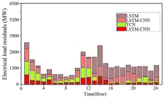- Table 5 shows the load forecasting results of different models in the Electrician Cup competition dataset. It can be known from Table 5 that among the various comparison models, the three-channel LSTM-CNN prediction model has a relatively high accuracy in power load prediction. Its RMSE is 321.198 MW, its MAE is 278.6 MW, and its MAPE is 0.974%. Compared with the LSTM, the CNN-LSTM model, and the TCN model, RMSE decreased by 187.659 MW, 104.998 MW, and 37.096 MW, respectively. The MAE decreased by 128.5 MW, 65.2 MW, and 26.1 MW, respectively. The MAPE decreased by 0.548%, 0.272%, and 0.109%, respectively. All three evaluation indicators decreased, indicating that the model in this section has a good effect on power load forecasting.