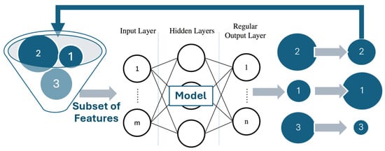Recursive feature elimination (RFE) selects features by recursively considering smaller and smaller sets of features. The estimator is trained on the initial set of features, and the importance of each feature is obtained either through any specific attribute such as weights assigned to the feature (coef_) or feature importance object (feature_importances_), which is calculated by the estimator model. Given that our model uses random forest as the estimator, the feature importance metric is defined by the frequency of the feature’s usage at split points of a random forest tree. The least important features are pruned from the current set of features. This procedure is recursively repeated on the pruned set until the desired number of features to be selected is finally reached. RFE was initially proposed to allow support vector machines to perform feature selection by iteratively training a model, ranking features, and then removing the lowest-ranking features []. More recently, Sharma et al. proposed a model based on deep reinforcement learning and feature selection through the recursive feature elimination method for effective intrusion and cyber threat detection. With recursive feature elimination, they improved computational costs by reducing the number of features, making the model more efficient compared to traditional methods [].