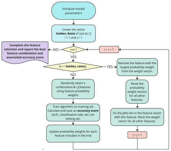 - In the next step, if enabled, the slotting method subroutine is determined, along with its initialization parameters: the number of trials and the number of features.Using the golden ratio (GR) slotting subroutine, we create an array of Fibonacci series (F) using Equation (3) and then use this array in our GR calculations in Equation (4):The idea behind using the GR is to have a larger number of trials in the first slots in order to reassess the base weight values, comparing them to most of the features of the dataset. The GR subroutine returns an array that is the length of the total number of features to be selected and is created by partitioning the total number of trials into individual slots assigned to each of these features.
