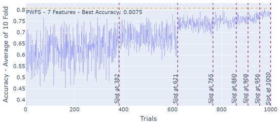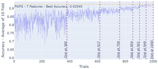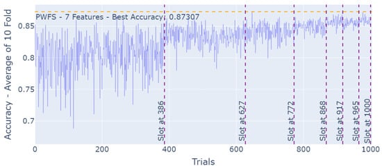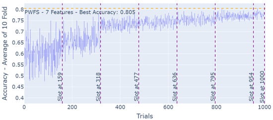 At each trial, a new sub-dataset is formed using the features selected. This new sub-dataset consists of all of the instances of the initial dataset. The PWFS algorithm aims to find the best features for the selected machine learning model; therefore, a model must be defined prior to using the PWFS algorithm. PWFS trains and tests this dataset using the predefined model in a K = 10-fold fashion. The average test accuracy result of the folds is calculated and saved to be used as a metric in the calculations of the weights to be assigned to the features. This process is repeated until the trial number meets the slot number, assuming the slotting algorithm is executed. The feature with the highest weight is selected to be used in all of the feature combinations in the remaining trials. This procedure proceeds until the very last feature is selected. The PWFS algorithm scans through all of the remaining features, evaluates the estimator model, and settles on the best-performing feature after going through all 10 folds.