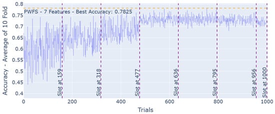 We explored two different predetermined methods for slotting in PWFS. For both of these methods, the last slot of the feature selection is defined to go through all of the remaining features that were not selected in the prior slots rather than a random sampling process and find the most significant, informative last feature depending on the performance metric. Linear slotting simply divides the number of trials by the number of features to be selected in a linear, equal fashion and assigns this number to each slot. Figure 4 represents the linear slotting for the feature selection task of the Turkish Music Evaluation Dataset using the PWFS method. The golden ratio slotting method uses the Fibonacci series to create an approach with larger slots in the first trials of PWFS to provide an “equal opportunity” for the features to be selected so that a better base can be achieved. Figure 5 represents “Golden Ratio” slotting for the feature selection task of the Turkish Music Evaluation Dataset using the PWFS method. Golden ratio slotting was proven to provide better feature selection and, thus, improved accuracy results compared to linear slotting. This trend was observed across other datasets considered in this paper.