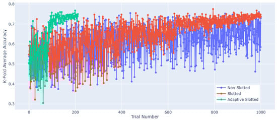 Adaptive slotting is a technique we developed to reduce the processing time of the PWFS algorithm. It operates by invoking a subroutine that dynamically monitors the weights assigned to individual features and identifies dominant features. This identification is achieved by comparing each feature’s weight to the median of the overall weight vector. If a dominant weight is detected, i.e., a feature whose weight significantly exceeds the median, the algorithm terminates the current slot early (i.e., it cuts short the number of trials originally allocated to that slot). After the slot is shortened, the user-defined slotting method (e.g., golden ratio or linear) is reapplied to generate a new slot location array for the remaining trials and features to be selected. This process continues iteratively, allowing the algorithm to focus computation on more informative features while skipping over less relevant ones earlier. A comparison of the slotted, non-slotted, and adaptive slotted performance for the Turkish Music Evaluation Dataset is displayed in Figure 7.