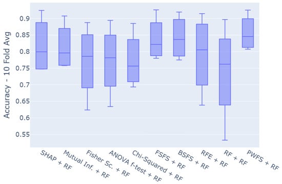 Datasets assembled using the selected seven features by each of the conventional methods were then used again to train and test a random forest model using the K = 10-fold convention. The accuracy scores of each method were obtained by averaging the accuracy score of the folds.