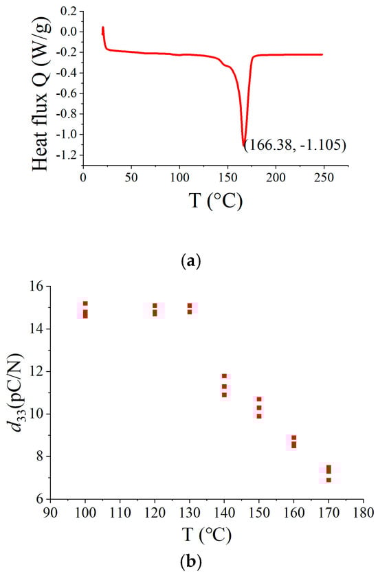 Temperature properties of PVDF (a) DSC result of PVDF films (b) d33 of PVDF.