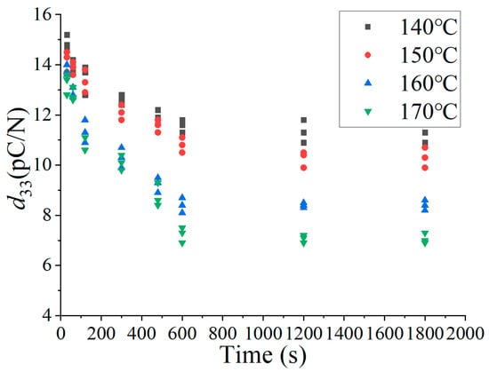 Experimental results show that d33 decreases under all tested temperature conditions as shown in Figure 3. At the initial moment, d33 decreases rapidly. As time duration increases, the rate of decrease in d33 slows down and eventually tends to be stable. From the figure, it can also be seen that the higher the temperature, the faster the initial piezoelectric performance of PVDF films decays and the value of d33 lowers eventually.
