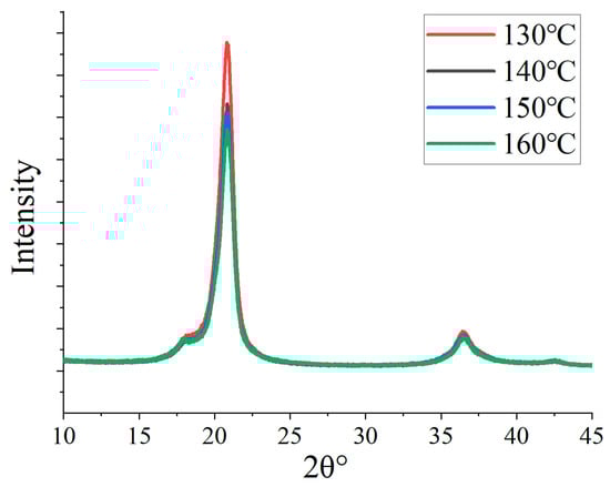 With increase in temperature, the crystal plane diffraction peak decreases, which means the content of the β phase decreases. Within the temperature range studied in this article, the β phase still occupies a relatively large proportion and does not drop to half of the room temperature even at the highest temperature of 160 °C.