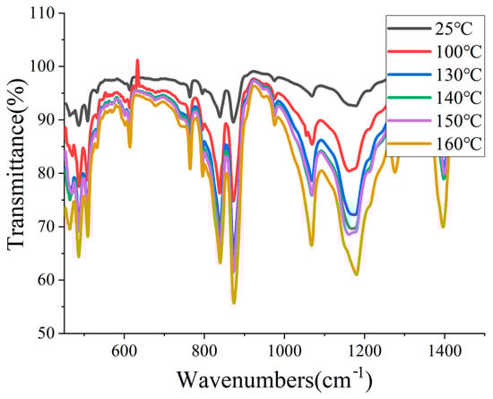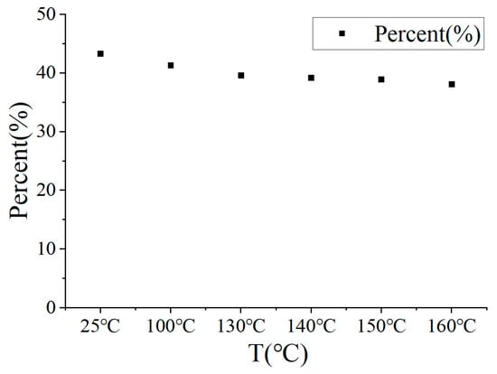 where Fβ represents the content of the β phase, and Aα and Aβ represent the absorption peak widths of the α and β phases in the FTIR graph, respectively. The calculated results are shown in Figure 6. It can be seen that the content of the β phase changes from 43% at 25 °C to 38% at 160 °C. Compared to the decrease in d33 from 15 pC/N to 7 pC/N in Figure 3, the amount of phase structure transformation from β phase to α phase is very small. From this point, it can be seen that the d33 change in the PVDF material studied in this article is not caused by phase transition. Thus, it is inferred that in a short-term high-temperature environment, the β phase does not directly transform into the α phase. Instead, as the temperature rises, the binding between the material structures weakens and the orientation of the β phase shifts, changing from an ordered arrangement to a disordered one, leading to a decrease in d33.