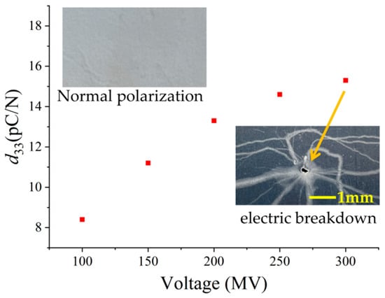 Results of d33 in the polarized PVDF film are shown in Figure 7. It can be seen that as the voltage increases, the piezoelectric performance of the film improves. At a voltage of 250 MV/m, the piezoelectric performance of the PVDF film recovers to its pre-high state, with a d33 of 15.0 pC/N. By further increasing the voltage, d33 can continue to increase reaching nearly 16 pC/N, exceeding the original d33 of the film. However, at a repolarization voltage of 300 MV/m, some areas of the film have already exhibited electrical breakdown, and a burnt hole appeared on the film, which can be seen from Figure 7. After the breakdown, the positive and negative are short-circuited, making it unable to be used as a sensor.