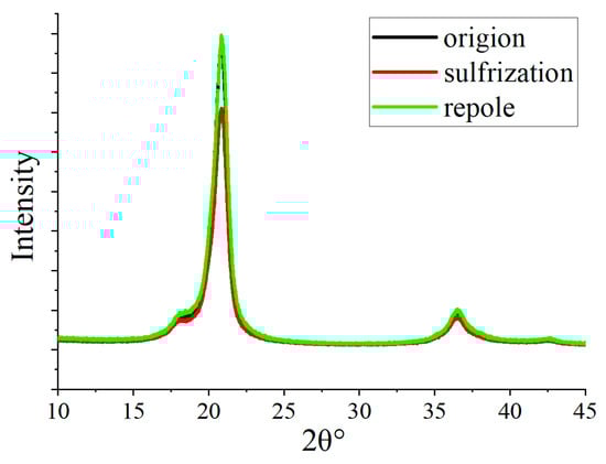To analyze the mechanism of the PVDF in the process of repolarization, XRD were conducted. As shown in Figure 8, it can be seen that the content of the β phase decreases first and then increases. The peak intensity after repolarization has returned to the initial state. Thus, the film can be restored to its original performance. In addition, if the repolarization of PVDF film is carried out under certain temperature conditions (70–130 °C), it can further reduce the voltage and time duration, which can improve the polarization efficiency. We also conducted FTIR experiments on the repolarized PVDF, and the experimental results showed that the content of β phase was around 40%. The experimental results further indicate that short-term high temperature and polarization have a greater impact on the orientation of the β phase.