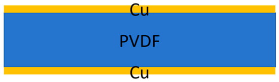 Firstly, as shown in Figure 9, a simulation model of an equivalent “sandwich structure” was constructed based on the actual form of the PVDF sensor. The model includes the upper electrode layer Cu, the PVDF piezoelectric layer and the lower electrode layer Cu. The structural parameters of each part were set as the length of 40 mm, the width of 10 mm, and thickness of 110 um.