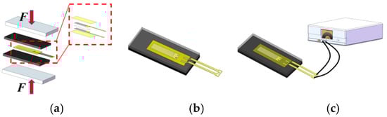Preparation of embedded sensor and repolarization method: (a) simulating the vulcanization process using a hot press plate; (b) perspective view of the embedded sensor; (c) repolarization of the embedded sensor.