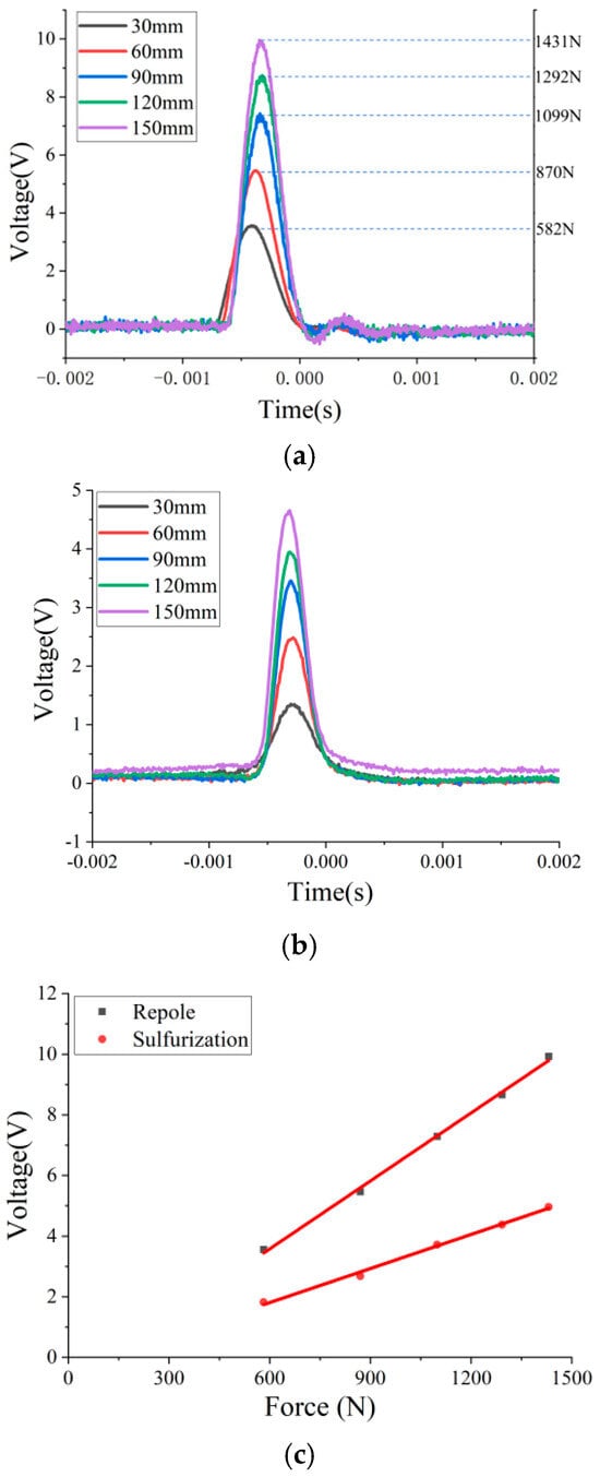 Performance experiments were performed on both vulcanized and repolarized devices. By collecting the piezoelectric signals under different impact heights, a force–electricity correlation for the device was established. This force–electric correlation allows for a more intuitive comparison of the sensitivity between vulcanized devices and repolarized devices.