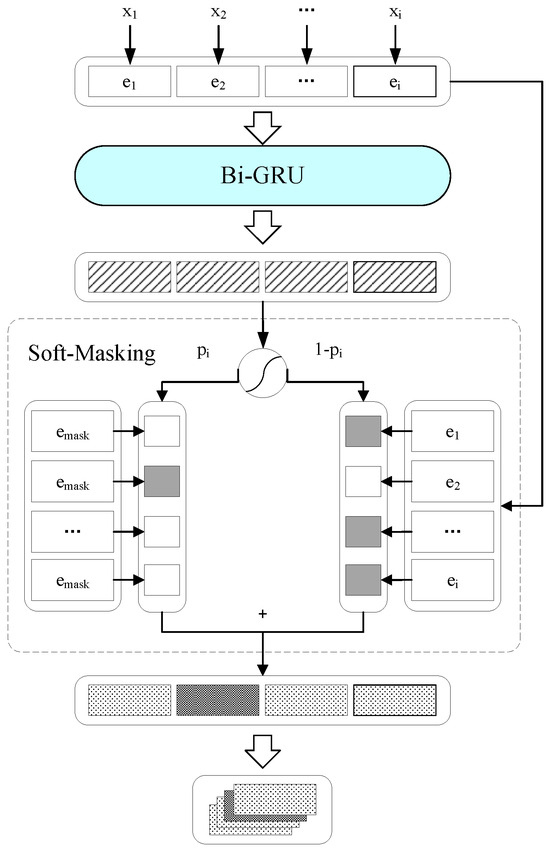 The perturbation detection module in this study consists of a Bi-GRU model and a soft-masking layer, designed to determine whether input samples are adversarial. This module aims to distinguish between adversarial examples and clean samples, forwarding detected adversarial examples to the perturbation correction module to eliminate their adversarial nature, thereby achieving defense against adversarial attacks. On the one hand, the module avoids unnecessary modifications to clean samples; on the other hand, it enhances the efficiency of the defense framework. The architecture of the perturbation detection module in the LLMAD method is illustrated in Figure 2.