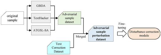 Construction of adversarial perturbation dataset. First, state-of-the-art adversarial attack algorithms are applied to original samples to generate three adversarial examples, which are combined into an adversarial example dataset. This dataset is then merged with the text correction dataset, ultimately forming the adversarial perturbation dataset used in the fine-tuning phase of large language models.
