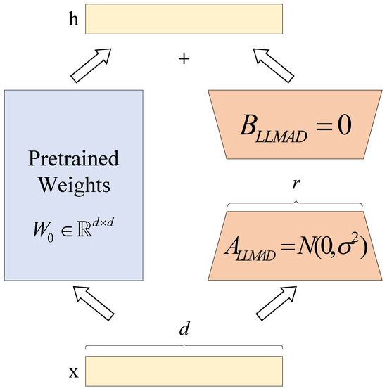 During training, remains frozen and receives no gradient updates, while and contain trainable parameters. For , the modified forward propagation result is given via Equation (16):