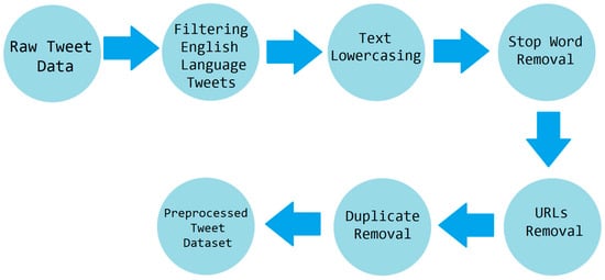 Data preprocessing is an important step to increase the quality and usability of tweet data. The data preprocessing workflow is visualized in Figure 1. All the following steps were accomplished with Python version 3.8.10: