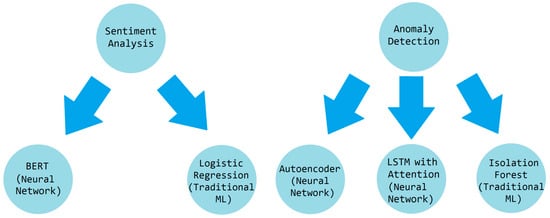 After data preprocessing, two different analyses (sentiment analysis and anomaly detection) were carried out using five different methods (Figure 2). The first analysis (sentiment analysis) was carried out using a neural network with the pre-trained transformer-based BERT model. A traditional machine learning approach with logistic regression was used for the same task to contrast the neural network for sentiment analysis. The second analysis was anomaly detection, where the neural network was divided into two categories, autoencoder neural network and LSTM neural network, with an integrated attention mechanism. For the traditional machine learning approach, an isolation forest was used for anomaly detection.