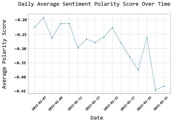 A visualization of daily average sentiment polarity scores (Figure 3) reveals distinct temporal variations, illustrating fluctuations within predominantly negative sentiment. Sentiment scores showed clear peaks and fluctuations, reflecting public reactions as the crisis unfolded in real time. Periods exhibiting sharp declines suggest intensified negative emotional responses, perhaps triggered by escalating events or worsening news, while periods of relatively less negative sentiment may correspond to phases of crisis stabilization or expressions of community solidarity and relief.