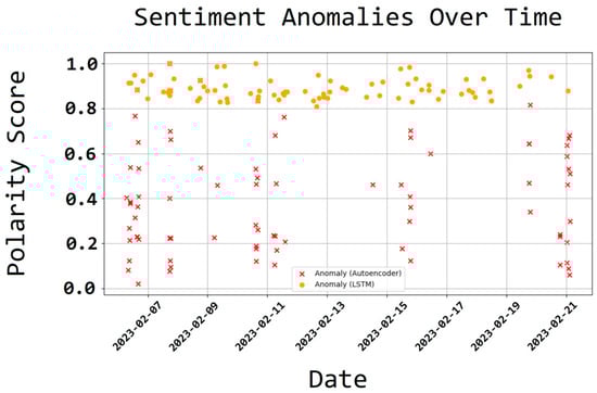 In Figure 4, it can be seen that the anomalies detected by the autoencoder (red crosses) are mainly located in the lower to middle part of the graph, reflecting negative to slightly positive sentiments. Given that the autoencoder recognizes anomalies on the reconstruction error, it has detected sentiments that deviated from the typical neutral or negative sentiments characteristic of crisis-related tweets. In contrast, the LSTM anomalies (yellow circles) are located in the upper part of the graph, reflecting high polarity anomalies. The LSTM model recognized anomalies in the higher polarity range, indicating unusually strong positive sentiments that deviated from the predicted sentiment trajectories.